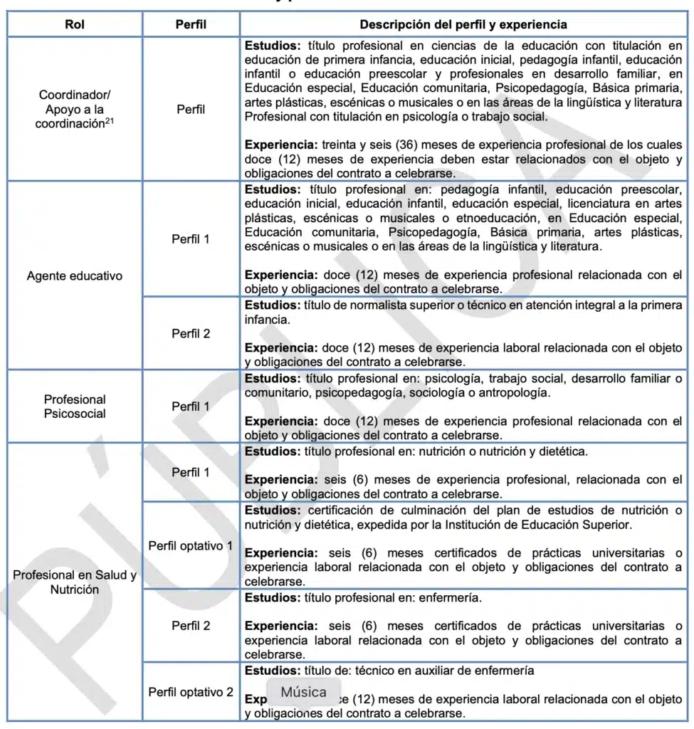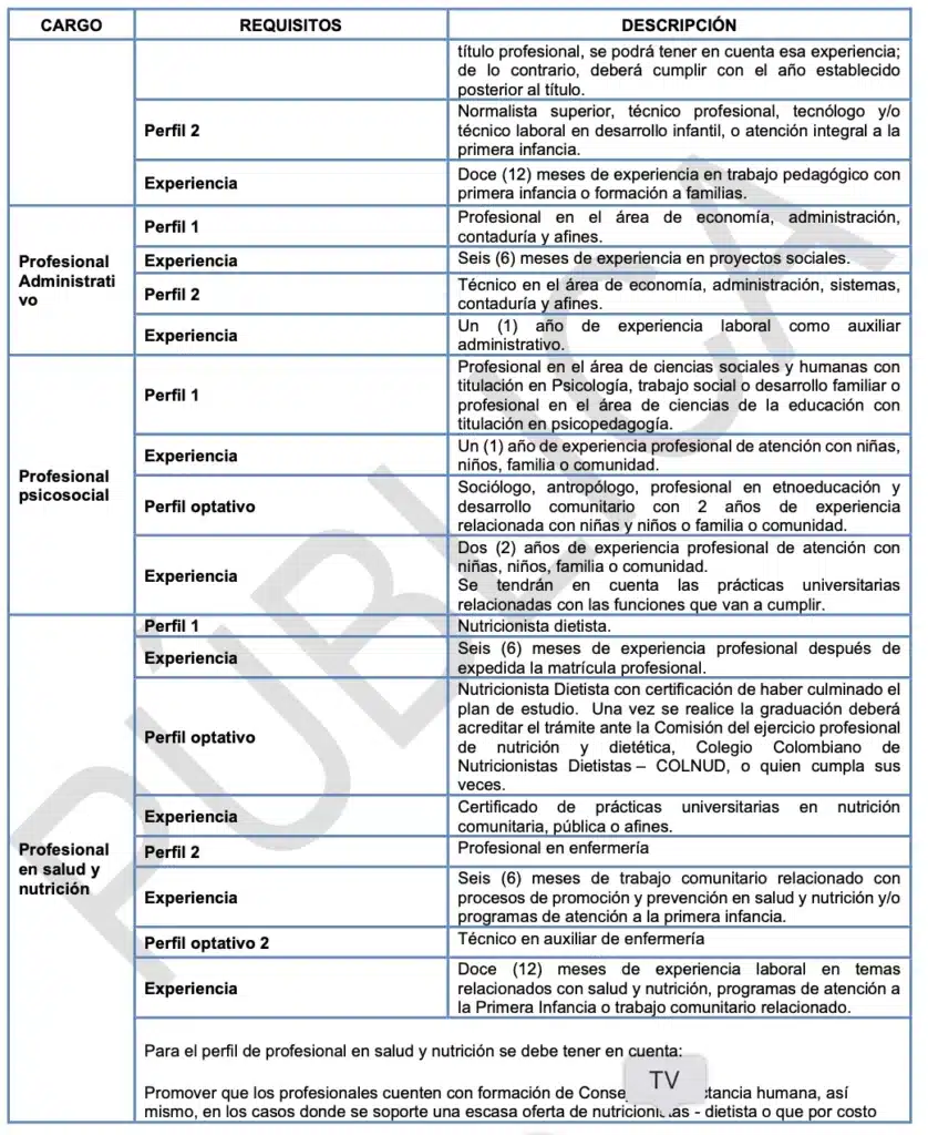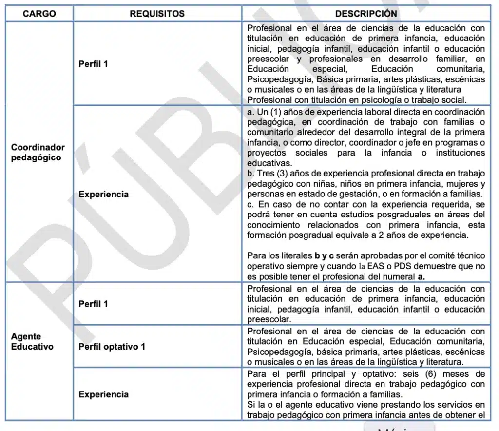 Estudios: título profesional en pedagogía infantil, educación preescolar, educación inicial, educación infantil, educación especial, psicopedagogía, etnoeducación, psicología, sociología, trabajo social, antropología.